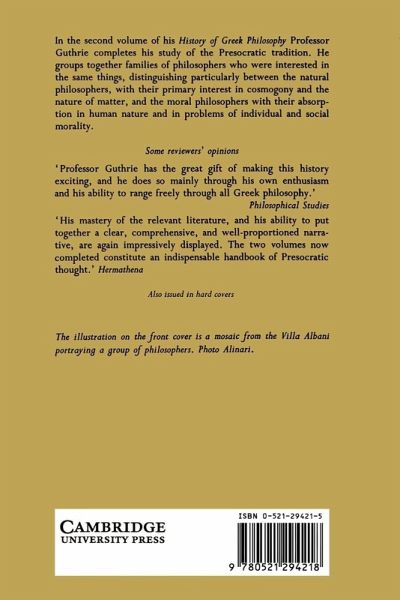 In the second volume of his History of Greek Philosophy Professor Guthrie completes his study of the Presocratic tradition. He groups together families of philosophers who were interested in the same things, distinguishing particularly between the natural philosopher, with their primary interest in cosmogony and the nature of matter, and the moral philosopher with their absorption in human nature and in problems of individual and social morality.