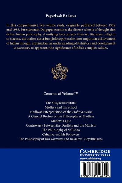 In this benchmark five-volume study, originally published between 1922 and 1955, Surendranath Dasgupta examines the principal schools of thought that define Indian philosophy. A unifying force greater than art, literature, religion, or science, Professor Dasgupta describes philosophy as the most important achievement of Indian thought, arguing that an understanding of its history is necessary to appreciate the significance and potentialities of India's complex culture. Volume IV provides an examination of the Bhagavata Purana, Madhva, the controversy between the Dualists and the Monists, the philosophy of Vallabha, Caitanya and his followers, and the philosophy of Jiva Gosvami and Baladeva Vidyabhusana.