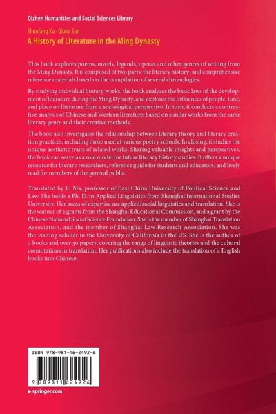 This book explores poems, novels, legends, operas and other genres of writing from the Ming Dynasty. It is composed of two parts: the literary history; and comprehensive reference materials based on the compilation of several chronologies. By studying individual literary works, the book analyzes the basic laws of the development of literature during the Ming Dynasty, and explores the influences of people, time, and place on literature from a sociological perspective. In turn, it conducts a contrastive analysis of Chinese and Western literature, based on similar works from the same literary genre and their creative methods. The book also investigates the relationship between literary theory and literary creation practices, including those used at various poetry schools. In closing, it studies the unique aesthetic traits of related works. Sharing valuable insights and perspectives, the book can serve as a role model for future literary history studies. It offers a unique resource for literary researchers, reference guide for students and educators, and lively read for members of the general public.