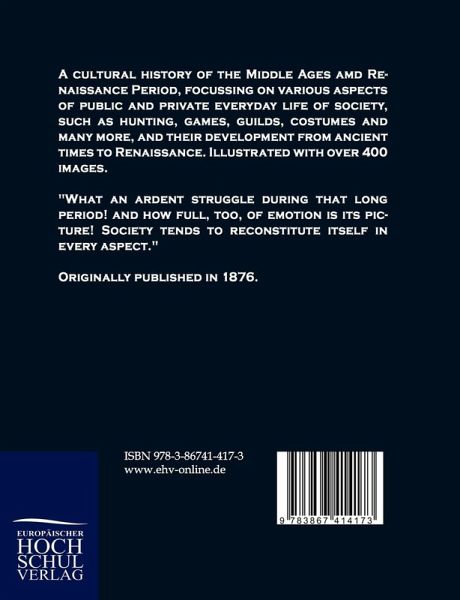A cultural history of the Middle Ages amd Renaissance Period, focussing on various aspects of public and private everyday life of society, such as hunting, games, guilds, costumes and many more, and their development from ancient times to Renaissance. Illustrated with over 400 images. "What an ardent struggle during that long period! and how full, too, of emotion is its picture! Society tends to reconstitute itself in every aspect." Originally published in 1876.