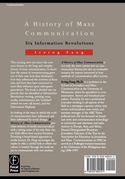 In looking at the ways in which the tools of communication have influenced and been influenced by social change, A History of Mass Communication provides students of media and journalism with a strong sense of the way their chosen field affects how society functions. Providing a broad-based approach to media history, Dr. Fang encourages the reader to take a careful look at where our culture is headed through the tools we use to communicate with one another.