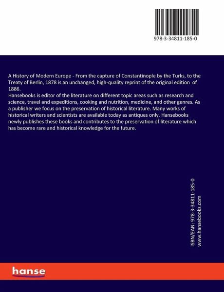 A History of Modern Europe - From the capture of Constantinople by the Turks, to the Treaty of Berlin, 1878 is an unchanged, high-quality reprint of the original edition of 1886.Hansebooks is editor of the literature on different topic areas such as research and science, travel and expeditions, cooking and nutrition, medicine, and other genres. As a publisher we focus on the preservation of historical literature. Many works of historical writers and scientists are available today as antiques only. Hansebooks newly publishes these books and contributes to the preservation of literature which has become rare and historical knowledge for the future.