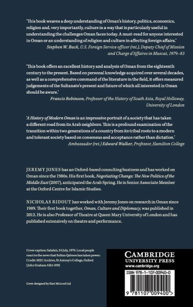 The ideal introduction to the history of modern Oman from the eighteenth century to the present, this book combines the most recent scholarship on Omani history with insights drawn from a close analysis of the politics and international relations of contemporary Oman. Jeremy Jones and Nicholas Ridout offer a distinctive new approach to Omani history, building on postcolonial thought and integrating the study of politics and culture. The book addresses key topics including Oman's historical cosmopolitanism, the distinctive role of Omani Islam in the country's social and political life, Oman's role in the global economy of the nineteenth century, insurrection and revolution in the twentieth century, the role of Sultan Qaboos in the era of oil and Oman's unique regional and diplomatic perspective on contemporary issues.