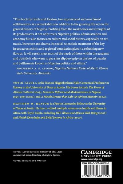 'This book by Falola and Heaton, two experienced and now famed collaborators, is a remarkable new addition to the growing library on a general history of Nigeria. Profiting from the weaknesses and strengths of its predecessors, it treats not only Nigerian politics, administration and economy but focuses also on culture and social history especially on art, music, literature and drama. Its social-scientistic treatment of the key issues across ethnic and regional boundaries gives it a refreshing new flavour. It will surely meet most of the needs of those within the academy and outside it who want to get a less slippery grip on the box of puzzles and bafflements known as Nigerian politics and affairs.' Professor A. E. Afigbo, Nigerian National Order of Merit, Ebonyi State University, Abakaliki