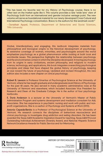 Robert B. Lawson is Professor Emeritus of Psychological Science at the University of Vermont, where he has taught graduate and undergraduate level History of Psychology for the past 40 years. He also served in many academic administrative roles at the University of Vermont and elsewhere, which included Associate Vice President for Research and Dean of the Graduate College. He is the author of four psychology textbooks. E. Doris Anderson is a lecturer at the University of Vermont's Master of Public Administration Program and systems development and mediation consultant for A&L Associates. She has experience in psychiatric nursing and work with public and nonprofit organizations. She is co-author of Psychology and Systems at Work (2013). Antonio Cepeda-Benito is a Professor of Psychological Science at the University of Vermont. His research connects the disciplines of behavioral neuroscience and clinical psychology to investigate drug addiction and eating disorders. He has been awarded the Texas A&M Academic Inspiration Award for teaching, Texas A&M Provost Outstanding Individual Achievement Diversity Award, and National Hispanic Science Network Excellence Awards for Public Service and for Mentoring.