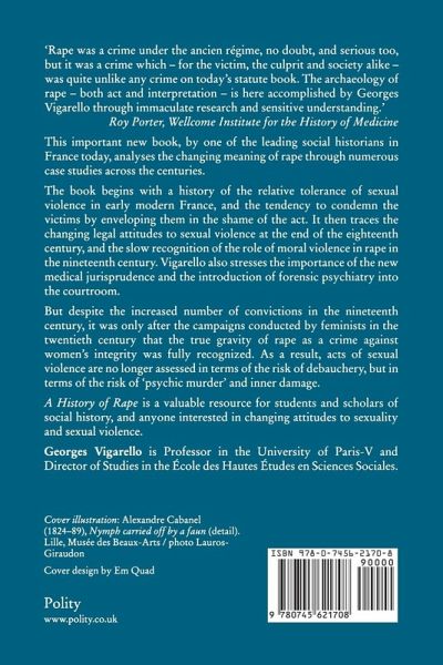 This important new book, by one of the leading social historians in France today, analyses the changing meaning of rape through numerous case studies across the centuries. The book begins with a history of the relative tolerance of sexual violence in early modern France, and the tendency to condemn the victims by enveloping them in the shame of the act. It then traces the changing legal attitudes to sexual violence at the end of the eighteenth century, and the slow recognition of the role of moral violence in rape in the nineteenth century. Vigarello also stresses the importance of the new medical jurisprudence and the introduction of forensic psychiatry into the courtroom. But despite the increased number of convictions in the nineteenth century, it was only after the campaigns conducted by feminists in the twentieth century that the true gravity of rape as a crime against women's integrity was fully recognized. As a result, acts of sexual violence are no longer assessed in terms of the risk of debauchery, but in terms of the risk of 'psychic murder' and inner damage. A History of Rape is a valuable resource for students and scholars of social history, and anyone interested in changing attitudes to sexuality and sexual violence