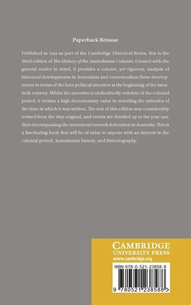 Published in 1912 as part of the Cambridge Historical Series, this is the third edition of The History of the Australasian Colonies. Created with the general reader in mind, it provides a concise, yet rigorous, analysis of historical developments in Australasia and contextualises these developments in terms of the later political situation at the beginning of the twentieth century. Whilst the narrative is undoubtedly redolent of the colonial period, it retains a high documentary value in revealing the attitudes of the time in which it was written. The text of the this edition was considerably revised from the 1895 original, and events are detailed up to the year 1911, thus encompassing the movement towards federation in Australia. This is a fascinating book that will be of value to anyone with an interest in the colonial period, Australasian history, and historiography.