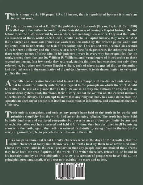 The author devoted years to the examination of the subject of Baptists history, Truth only is changeless, and only as any people have held to the truth in its purity and primitive simplicity has the world had an unchanging religion. The truth has been held by individual men and scattered companies but never in an unbroken continuity by any sect as such. Sect after sect has appeared and held it for a time, then has destroyed itself by mixing error with the truth; again, the truth has evinced its divinity by rising afresh in the hands of a newly organized people, to perpetuate its diffusion in the earth. It is enough to show that what Christ’s churches were in the days of the Apostles, that the Baptist churches of today find themselves. The truths held by them have never died since Christ gave them, and in the exact proportion that any people have maintained these truths they have been the true Baptists of the world. The writer therefore, refused to be bound in his investigations by an iron obligation to show a succession of people who have held all the principles, great and small, of any sect now existing--no more and no less. A lamentable lack of intelligence exists amongst us in regard to our origin and principles as Baptists. This book is written for the purpose of putting within the reach of all such facts as shall inform them of their religions history and what it cost the fathers of our faith to defend the same.
