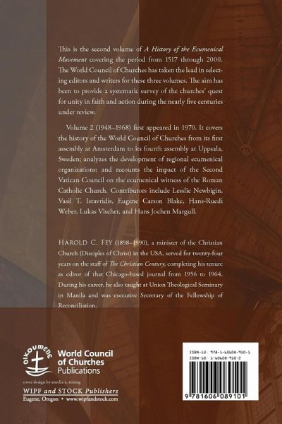 Synopsis: This is the second volume of A History of the Ecumenical Movement covering the period from 1517 through 2000. The World Council of Churches has taken the lead in selecting editors and writers for these three volumes. The aim has been to provide a systematic survey of the churches' quest for unity in faith and action during the nearly five centuries under review. Volume 2 (1948-1968) first appeared in 1970. It covers the history of the World Council of Churches from its first assembly at Amsterdam to its fourth assembly at Uppsala, Sweden; analyzes the development of regional ecumenical organizations; and recounts the impact of the Second Vatican Council on the ecumenical witness of the Roman Catholic Church. Contributors include Lesslie Newbigin, Vasil T. Istavridis, Eugene Carson Blake, Hans-Ruedi Weber, Lukas Vischer, and Hans Jochen Margull. Editor Biography: Harold C. Fey (1898-1990), a minister of the Christian Church (Disciples of Christ) in the USA, served for twenty-four years on the staff of The Christian Century, completing his tenure as editor of that Chicago-based journal from 1956 to 1964. During his career, he also taught at Union Theological Seminary in Manila and was executive Secretary of the Fellowship of Reconciliation.