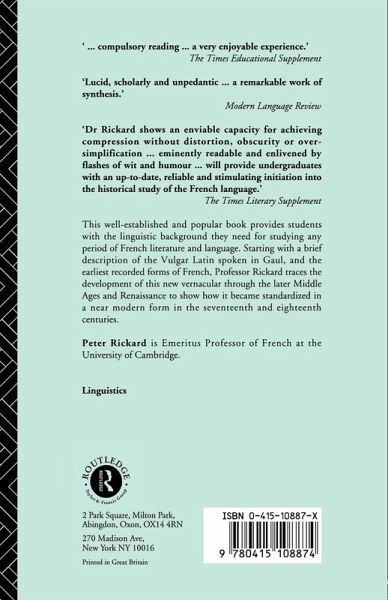 This well-established and popular book provides students with all the linguistic background they need for studying any period of French literature. For the second edition the text has been revised and updated throughout, and the two final chapters on contemporary French, and its position as a world language, have been completely rewritten. Starting with a brief description of the Vulgar Latin spoken in Gaul, and the earliest recorded forms of French, Peter Rickard traces the development of the language through the later Middle Ages and Renaissance to show how it became standardized in a near modern form in the seventeenth and eighteenth centuries.
