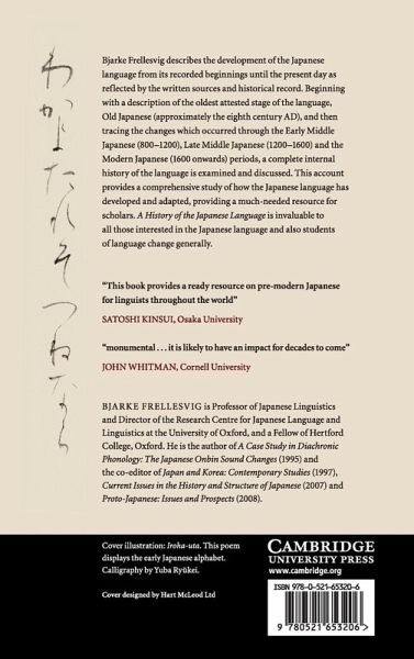 Bjarke Frellesvig describes the development of the Japanese language from its recorded beginnings until the present day as reflected by the written sources and historical record. Beginning with a description of the oldest attested stage of the language, Old Japanese (approximately the eighth century AD), and then tracing the changes which occurred through the Early Middle Japanese (800-1200), Late Middle Japanese (1200-1600) and the Modern Japanese (1600-onwards) periods, a complete internal history of the language is examined and discussed. This account provides a comprehensive study of how the Japanese language has developed and adapted, providing a much needed resource for scholars. A History of the Japanese Language is invaluable to all those interested in the Japanese language and also students of language change generally.