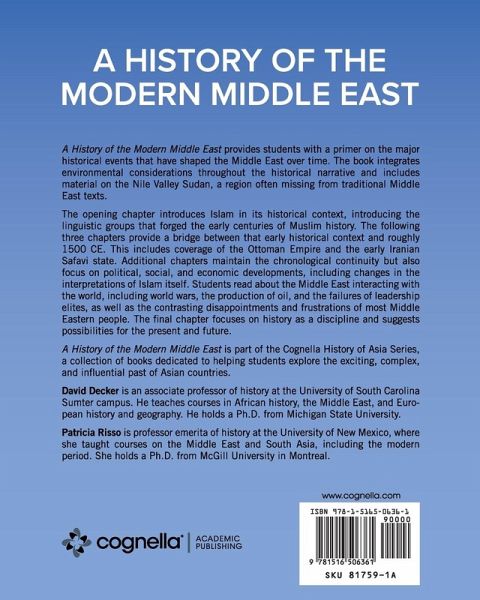 A History of the Modern Middle East provides students with a primer on the major historical events that have shaped the Middle East over time. The book integrates environmental considerations throughout the historical narrative and includes material on the Nile Valley Sudan, a region often missing from traditional Middle East texts. The opening chapter introduces Islam in its historical context, introducing the linguistic groups that forged the early centuries of Muslim history. The following three chapters provide a bridge between that early historical context and roughly 1500 CE. This includes coverage of the Ottoman Empire and the early Iranian Safavi state. Additional chapters maintain the chronological continuity but also focus on political, social, and economic developments, including changes in the interpretations of Islam itself. Students read about the Middle East interacting with the world, including world wars, the production of oil, and the failures of leadership elites, as well as the contrasting disappointments and frustrations of most Middle Eastern people. The final chapter focuses on history as a discipline and suggests possibilities for the present and future. ¿¿A History of the Modern Middle East is part of the Cognella History of Asia Series, a collection of books dedicated to helping students explore the exciting, complex, and influential past of Asian countries.