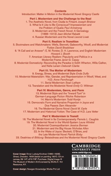 1. The aesthetic novel, from Ouida to Firbank Joseph Bristow 2. What is it like to be conscious? Impressionism and the problem of qualia Paul Armstrong 3. Modernism and the French novel: a genealogy, 1888-1913 Jean-Michel Rabaté 4. Russian modernism and the novel Leonid Livak 5. Bootmakers and watchmakers: Wells, Bennett, Galsworthy, Woolf, and modernist fiction David Bradshaw 6. 'A call and an answer': E. M. Forster, D. H. Lawrence, and English modernism Howard J. Booth 7. American literary realism: popularity and politics in a modernist frame Janet Galligani Casey 8. Modernist domesticity: reconciling the paradox in Edith Wharton, Willa Cather, and Nella Larsen Deborah Clarke 9. Energy, stress, and modernist style Enda Duffy 10. Modernist materialism: war, gender, and representation Anne Fernihough 11. Serial modernism Sean Latham 12. Translation and the modernist novel Emily O. Wittman 13. Modernist style and the 'inward turn' in German-language fiction Ritchie Robertson 14. Mann's modernism Todd Kontje 15. Democratic form and narrative proportion in Joyce and Dos Passos Samuel Alexander 16. The modernist genre novel David Earle 17. Modernism and historical fiction: the case of H. D. Lara Vetter 18. The modernist novel in its contemporaneity Pamela L. Caughie 19. The modernist novel in the world-system Lara Winkiel 20. Modernist cosmopolitanism Jessica Berman 21. Modernism and the big house Nicholas Allen 22. In the wake of Joyce: Beckett, O'Brien, and the late modernist novel Patrick Bixby 23. Destinies of Bildung: belatedness and the modernist novel Gregory Castle.
