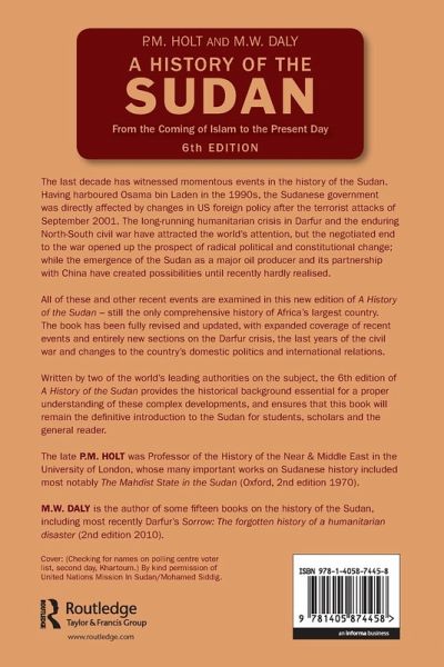 A History of the Sudan by Martin Daly and PM Holt, sixth edition, has been fully revised and updated and covers the most recent developments that have occurred in Sudan over the last nine years, including the crisis in Darfur. The most notable developments that this text covers includes the decades-long civil war in the South (with the signing of the Comprehensive Peace Agreement in January 2005); the emergence of the Sudan as an oil-producer and exporter, and its resulting higher profile in global economic affairs, notably as a partner of China; the emergence of al-Qaeda, the relations of Sudanese authorities with Osama bin Laden (whose headquarters were in the Sudan in the 1990s), and the Sudanese government's complicated relations with the West. This text is key introductory reading for any student of North Africa.