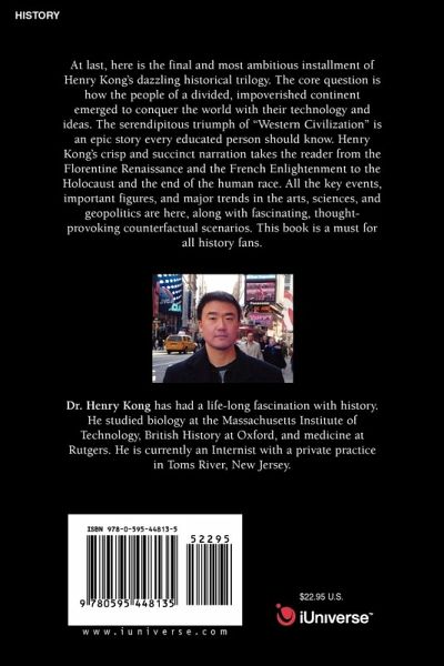 At last, here is the final and most ambitious installment of Henry Kong's dazzling historical trilogy. The core question is how the people of a divided, impoverished continent emerged to conquer the world with their technology and ideas. The serendipitous triumph of "Western Civilization" is an epic story every educated person should know. Henry Kong's crisp and succinct narration takes the reader from the Florentine Renaissance and the French Enlightenment to the Holocaust and the end of the human race. All the key events, important figures, and major trends in the arts, sciences, and geopolitics are here, along with fascinating, thought provoking counter factual scenarios. This book is a must for all history fans.