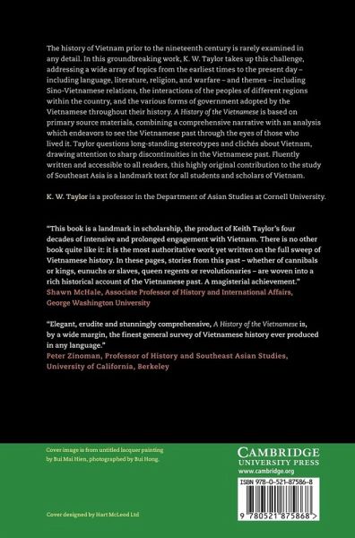 The history of Vietnam prior to the nineteenth century is rarely examined in any detail. In this groundbreaking work, K. W. Taylor takes up this challenge, addressing a wide array of topics from the earliest times to the present day - including language, literature, religion, and warfare - and themes - including Sino-Vietnamese relations, the interactions of the peoples of different regions within the country, and the various forms of government adopted by the Vietnamese throughout their history. A History of the Vietnamese is based on primary source materials, combining a comprehensive narrative with an analysis which endeavours to see the Vietnamese past through the eyes of those who lived it. Taylor questions long-standing stereotypes and clichés about Vietnam, drawing attention to sharp discontinuities in the Vietnamese past. Fluently written and accessible to all readers, this highly original contribution to the study of Southeast Asia is a landmark text for all students and scholars of Vietnam.