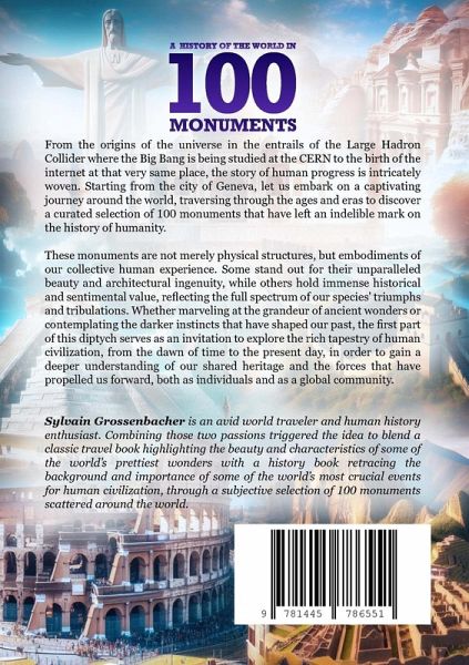From the origins of the universe in the entrails of the Large Hadron Collider where the Big Bang is being studied at the CERN to the birth of the internet at that very same place, the story of human progress is intricately woven. Starting from the city of Geneva, let us embark on a captivating journey around the world, traversing through the ages and eras to discover a curated selection of 100 monuments that have left an indelible mark on the history of humanity. These monuments are not merely physical structures, but embodiments of our collective human experience. Some stand out for their unparalleled beauty and architectural ingenuity, while others hold immense historical and sentimental value, reflecting the full spectrum of our species' triumphs and tribulations. Whether marveling at the grandeur of ancient wonders or contemplating the darker instincts that have shaped our past, the first part of this diptych serves as an invitation to explore the rich tapestry of human civilization, from the dawn of time to the present day, in order to gain a deeper understanding of our shared heritage and the forces that have propelled us forward, both as individuals and as a global community.