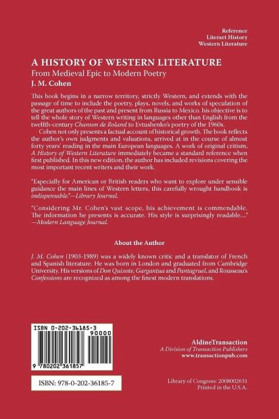 This book begins in a narrow territory, strictly Western, and extends with the passage of time to include the poetry, plays, novels, and works of speculation of the great authors of the past and present, from Russia to Mexico. His objective is to tell the whole story of Western writing in languages other than English from the twelfth-century Chanson de Roland to Evtushenko's poetry of the 1960's.Cohen not only presents a factual account of historical growth. The book reflects the author's own judgments and valuations, arrived at in the course of almost forty years' reading in the main European languages. A work of original criticism, "A History of Western Literature" immediately became a standard reference when first published. In this new edition, the author has included revisions covering the most important recent writers and their work.