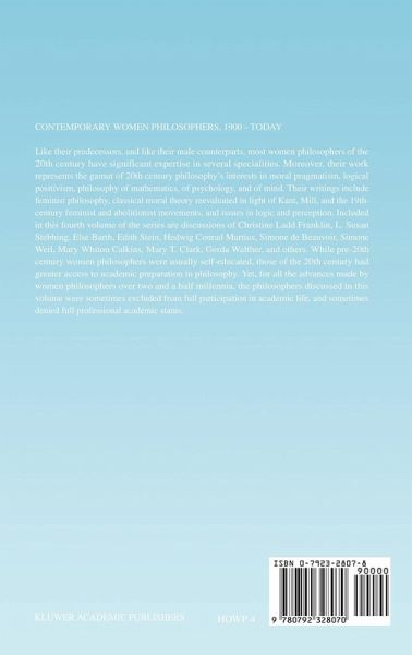 Like their predecessors, and like their male counterparts, most women philosophers of the 20th century have significant expertise in several specialities. Moreover, their work represents the gamut of 20th century philosophy's interests in moral pragmatism, logical positivism, philosophy of mathematics, of psychology, and of mind. Their writings include feminist philosophy, classical moral theory reevaluated in light of Kant, Mill, and the 19th century feminist and abolitionist movements, and issues in logic and perception. Included in the fourth volume of the series are discussions of L. Susan Stebbing, Edith Stein, Hedwig Conrad Martius, Simone de Beauvoir, Simone Weil, Mary Whiton Calkins, Gerda Walther, and others. While pre-20th century women philosophers were usually self-educated, those of the 20th century had greater access to academic preparation in philosophy. Yet, for all the advances made by women philosophers over two and a half millennia, the philosophers discussed in this volume were sometimes excluded from full participation in academic life, and sometimes denied full professional academic status.