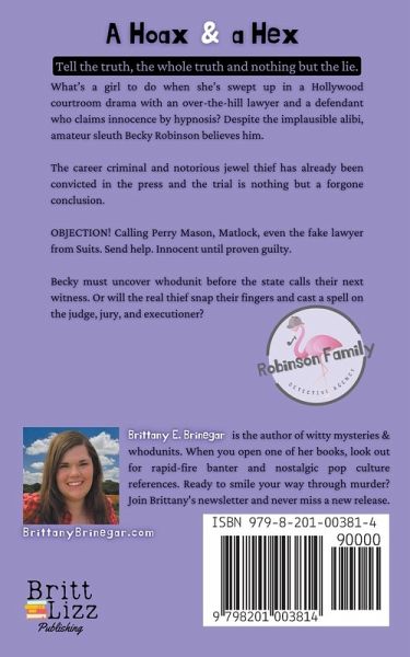 Vacation with the characters you love from the Hollywood Whodunit series in a top-secret summer spinoff. Tell the truth, the whole truth and nothing but the lie. What's a girl to do when she's swept up in a Hollywood courtroom drama with an over-the-hill lawyer and a defendant who claims innocence by hypnosis? Despite the implausible alibi, amateur sleuth Becky Robinson believes him. The career criminal and notorious jewel thief has already been convicted in the press and the trial is nothing but a forgone conclusion. ¿OBJECTION! Calling Perry Mason, Matlock, even the fake lawyer from Suits. Send help. Innocent until proven guilty. ¿Becky must uncover whodunit before the state calls their next witness. Or will the real thief snap their fingers and cast a spell on the judge, jury, and executioner? ---------------- A Hoax & a Hex is the third installment in the Robinson Family Detective cozy mystery series. If you love best friend shenanigans, quirky suspects, and adorable animals this series is for you! Robinson Family Detective Agency Series OrderBook 1: Red Herrings & Pink Flamingos Book 2: McGuffins & Birdies Book 3: A Hoax & a Hex Book 4. A Patsy & a Pastry Book 5: A Trick & a Pony Book 6: A Masterpiece & a Murder