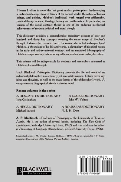 Thomas Hobbes is one of the first great modern philosophers. In particular, his version of the social contract theory has proved to be one of the enduring intellectual achievements of modern political and moral thought. This dictionary provides a comprehensive and cohesive expository account of about one hundred and fifty key concepts covering the entire range of Hobbes's thought, from philosophy, political theory and science, to theology, history and mathematics. Extensively cross-referenced, the volume also includes a biography of Hobbes, a chronology of Hobbes's life and works, a chronology of historical events in the early and mid-seventeenth century, and an annotated bibliography of Hobbes's major works, contemporary editions, and main secondary literature. This volume will be indispensable for students and researchers interested in Hobbes's life and thought. Each Blackwell Philosopher Dictionary presents the life and work of an individual philosopher in a scholarly yet accessible manner. Entries cover key ideas and thoughts, as well as the main themes of the philosopher's work. A comprehensive biographical sketch is also included.