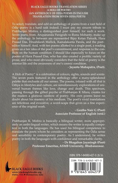 Holi is the festival of colors for Indians. It is celebrated by smearing or splashing colors on one's dear ones, transforming the everyday world into a brilliantly-hued, vibrant one. Here are seven poets of the Odia literary world, writing and celebrating as if with colors of the Rainbow that the readers would find highly enjoyable and evocable. These poets are of a highly evolved class, having practiced the sacred art form of poetry with admirable and unique styles. Their poems are no doubt a platter spanning, in general, the landscape of Odia poetry, offering its sublime rasas (aesthetics and tastes) and bhavas (expression). Only seven Odia poets were considered for this volume for various limiting factors. The first and foremost reason is the constraint of space that the publishers impose. The second and the most important one is they write very contemporary genres, shifted from the conventional styles, representing an inner world of Odia mind. Poets included are: Arupananda Panigrahi, Bijayketan Patnaik, Haraprasad Das, Hrushikesh Mallick, Kamalakanta Panda (Kalpanta), Prabhanjan K. Mishra, Runu Mohanty.