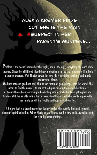 Alexia Kremer finds out she is the main suspect in her parent's murders. Problem is she doesn't remember that night, and as she digs, everything she once knew changes. Shade her childhood friend shows up but he is not as she remembers him; he is a shadow creature. With Shade's power this new life is terrifying, exciting, and highly addictive for Alexia. The lines between good and evil blur as she continues going deeper into this world. She needs to find the answers to her past to figure out what to do with her future. At twenty-three she is too young to be dealing with instincts that keep getting her into trouble. Will she be able to find the answers about herself and what really happened to her family or will the trouble and traps overwhelm her. A Hollow Soul is a brand-new urban fantasy series with horrific finds and romantic elements sprinkled within. Follow Alexia as she figures out this new world, as well as who she is at the heart of things.