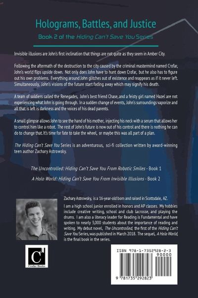 Holograms, Battles, and Justice Invisible illusions are John's first inclination that things are not quite as they seem in Amber City. Following the aftermath of the destruction to the city caused by the criminal mastermind named Crofar, John's world flips upside down. Not only does John have to hunt down Crofar, but he also has to figure out his own problems. Everything around John glitches out of existence and reappears as if it never left. Simultaneously, John's visions of the future start fading away which may signify his death. A team of soldiers called the Renegades, John's best friend Chase, and a feisty girl named Hazel are not experiencing what John is going through. In a sudden change of events, John's surroundings vaporize and all that is left is darkness and the voices of his dead parents. A small glimpse allows John to see the hand of his mother, injecting his neck with a serum that allows her to control him like a robot. The rest of John's future is now out of his control and there is nothing he can do to change that. It's time for fate to take the wheel, or maybe this was all part of a plan. The Hiding Can't Save You Series is an adventurous, sci-fi collection written by award-winning teen author Zachary Astrowsky. Age range: 8 -16 The Uncontrolled: Hiding Can't Save You From Robotic Smiles - Book 1 A Holo World: Hiding Can't Save You From Invisible Illusions - Book 2