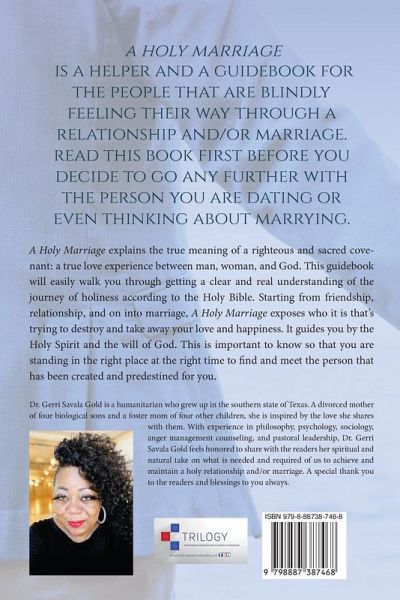 A HOLY MARRIAGE IS A HELPER AND GUIDEBOOK FOR THE PEOPLE THAT ARE BLINDLY FEELING THEIR WAY THROUGH A RELATIONSHIP AND/OR MARRIAGE. READ THIS BOOK FIRST BEFORE YOU DECIDE TO GO ANY FURTHER WITH THE PERSON YOU ARE DATING OR EVEN THINKING ABOUT MARRYING. A Holy Marriage explains the true meaning of a righteous and sacred covenant: a true love experience between man, woman, and God. This guidebook will easily walk you through getting a clear and real understanding of the journey of holiness according to the Holy Bible. Starting from friendship, relationship, and on into marriage. A Holy Marriage exposes who it is that's trying to story and take away your love and happiness. It guides you by the Holy Spirit and the will of God. This is important to know so that you are standing in the right place at the right time to find and meet the person that has been created and predestined for you.