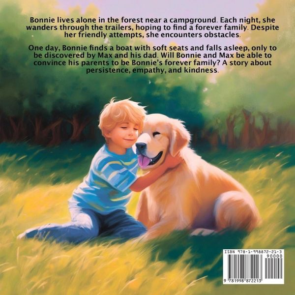 Bonnie lives alone in the forest near a campground. Each night, she wanders through the trailers, hoping to find a forever family. Despite her friendly attempts, she encounters obstacles. One day, Bonnie finds a boat with soft seats and falls asleep, only to be discovered by Max and his dad. Will Bonnie and Max be able to convince his parents to be Bonnie's forever family? A story about persistence, empathy, and kindness.