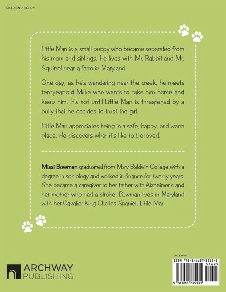 Little Man is a small puppy who became separated from his mom and siblings. He lives with Mr. Rabbit and Mr. Squirrel near a farm in Maryland. One day, as he's wandering near the creek, he meets ten-year-old Millie who wants to take him home and keep him. It's not until Little Man is threatened by a bully that he decides to trust the girl. Little Man appreciates being in a safe, happy, and warm place. He discovers what it's like to be loved.