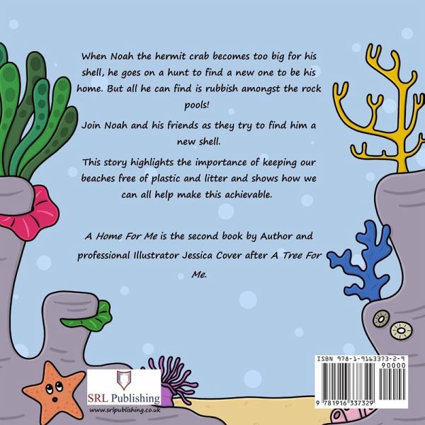 When Noah the hermit crab becomes too big for his shell he goes on a hunt to find a new one to be his home. But all he can find is rubbish amongst the rock pools! Join Noah and his friends as they try to find him a new shell. This story highlights the importance of keeping our beaches free of plastic and litter and shows how we can all help make this achievable. A Home For Me is the second book by Author and professional Illustrator Jessica Cover after A Tree For Me