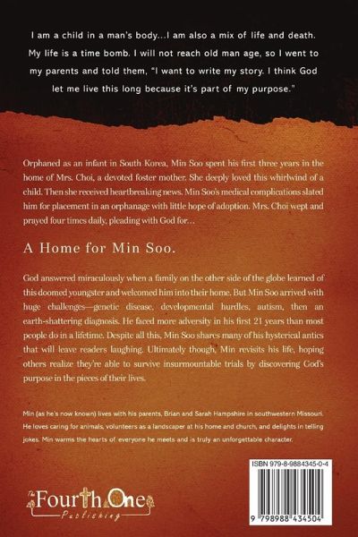 Orphaned at birth in South Korea, challenged with medical and developmental complications, and unadopted by age three, Min Soo's hope of finding a home seems lost. But God chooses a family on the other side of the world who opens their home to this whirlwind of a child. Although Min Soo is dearly loved, his constant challenges tax his adoptive parents to the core. When he's old enough to understand, Min Soo wonders if God has a purpose for "a child in a man's body." He comes to grips with the multiple obstacles he faces-except one. Then a devastating diagnosis hits! How will Min Soo overcome the impossible? Does God still have a purpose for his broken life? And will God grant him the "most desire" of his heart? Despite his many struggles, Min Soo has accomplished an amazing feat by writing his story. And his unique sense of humor shines throughout the pages of A Home for Min Soo: Putting Together the Pieces of My Life, bringing laughter as he and his family relay his numerous antics. Yet you'll be moved by the deep truths he shares. Min Soo hopes-through reading his story-you'll discover it's possible to survive insurmountable odds and find purpose in the pieces of your life.
