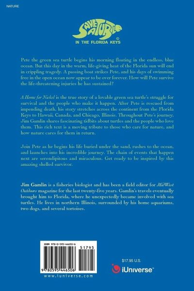 Pete the green sea turtle begins his morning floating in the endless, blue ocean. But this day in the warm, life-giving heat of the Florida sun will end in crippling tragedy. A passing boat strikes Pete, and his days of swimming free in the open ocean now appear to be over forever. How will Pete survive the life-threatening injuries he has sustained? A Home for Nickel is the true story of a lovable green sea turtle's struggle for survival and the people who make it happen. After Pete is rescued from impending death, his story stretches across the continent from the Florida Keys to Hawaii, Canada, and Chicago, Illinois. Throughout Pete's journey, Jim Gamlin shares fascinating tidbits about turtles and the people who love them. This rich text is a moving tribute to those who care for nature, and how nature cares for them in return. Join Pete as he begins his life buried under the sand, rushes to the ocean, and launches into his incredible journey. The chain of events that happen next are serendipitous and miraculous. Get ready to be inspired by this amazing shelled survivor.
