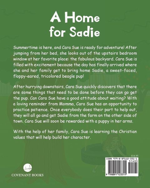Summertime is here, and Cara Sue is ready for adventure! After jumping from her bed, she looks out of the upstairs bedroom window at her favorite place: the fabulous backyard. Cara Sue is filled with excitement because the day has finally arrived where she and her family get to bring home Sadie, a sweet-faced, floppy-eared, tricolored beagle pup! After hurrying downstairs, Cara Sue quickly discovers that there are some things that need to be done before they can go get the pup. Can Cara Sue have a good attitude about waiting? With a loving reminder from Momma, Cara Sue has an opportunity to practice patience. Once everybody does their part to help out, they will all go and get Sadie from the farm on the other side of town. Cara Sue will soon be rewarded with a puppy in her arms. With the help of her family, Cara Sue is learning the Christian values that will help build her character.