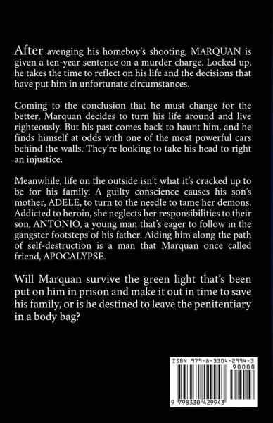After avenging his homeboy's shooting, MARQUAN is given a ten-year sentence on a murder charge. Locked up, he takes the time to reflect on his life and the decisions that have put him in unfortunate circumstances. Coming to the conclusion that he must change for the better, Marquan decides to turn his life around and live righteously. But his past comes back to haunt him, and he finds himself at odds with one of the most powerful cars behind the walls. They're looking to take his head to right an injustice. Meanwhile, life on the outside isn't what it's cracked up to be for his family. A guilty conscience causes his son's mother, ADELE, to turn to the needle to tame her demons. Addicted to heroin, she neglects her responsibilities to their son, ANTONIO, a young man that's eager to follow in the gangster footsteps of his father. Aiding him along the path of self-destruction is a man that Marquan once called friend, APOCALYPSE. Will Marquan survive the green light that's been put on him in prison and make it out in time to save his family, or is he destined to leave the penitentiary in a body bag?