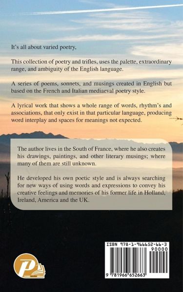 It's all about varied poetry. This collection of poetry and trifles, uses the palette, extraordinary range, and ambiguity of the English language. A series of poems, sonnets, and musings created in English but based on the French and Italian medieval poetry style. A lyrical work shows a whole range of words, rhythm's and associations, that only exist in that particular language, producing word interplay and spaces for meanings not expected.