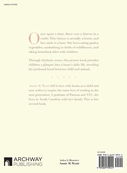 Once upon a time, there was a Queen in a castle. This Queen is actually a horse, and her castle is a barn. She loves eating garden vegetables, sunbathing in fields of wildflowers, and taking horseback rides with children. Through rhythmic verses, this picture book provides children a glimpse into a horse's daily life, revealing the profound bond between child and animal.