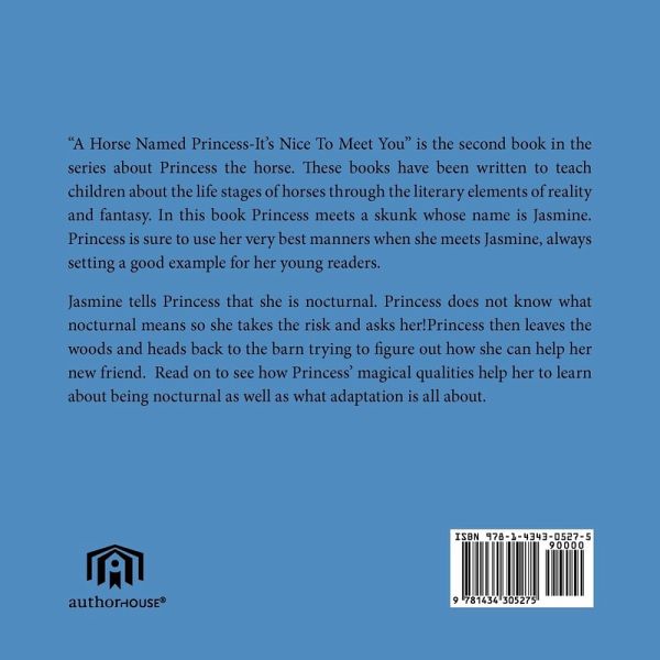 "A Horse Named Princess-It's Nice To Meet You" is the second book in the series about Princess the horse. These books have been written to teach children about the life stages of horses through the literary elements of reality and fantasy. In this book Princess meets a skunk whose name is Jasmine. Princess is sure to use her very best manners when she meets Jasmine, always setting a good example for her young readers. Jasmine tells Princess that she is nocturnal. Princess does not know what nocturnal means so she takes the risk and asks her!Princess then leaves the woods and heads back to the barn trying to figure out how she can help her new friend. Read on to see how Princess' magical qualities help her to learn about being nocturnal as well as what adaptation is all about.