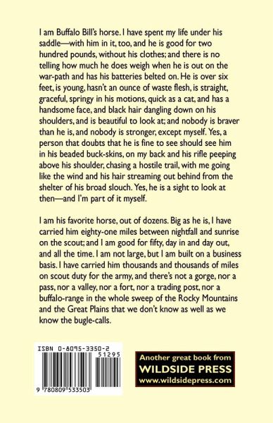 I am Buffalo Bill's horse. I have spent my life under his saddle -- with him in it, too, and he is good for two hundred pounds, without his clothes; and there is no telling how much he does weigh when he is out on the war-path and has his batteries belted on. He is over six feet, is young, hasn't an ounce of waste flesh, is straight, graceful, springy in his motions, quick as a cat, and has a handsome face, and black hair dangling down on his shoulders, and is beautiful to look at; and nobody is braver than he is, and nobody is stronger, except myself. Yes, a person that doubts that he is fine to see should see him in his beaded buck-skins, on my back and his rifle peeping above his shoulder, chasing a hostile trail, with me going like the wind and his hair streaming out behind from the shelter of his broad slouch. Yes, he is a sight to look at then -- and I'm part of it myself. I am his favorite horse, out of dozens. Big as he is, I have carried him eighty-one miles between nightfall and sunrise on the scout; and I am good for fifty, day in and day out, and all the time. I am not large, but I am built on a business basis. I have carried him thousands and thousands of miles on scout duty for the army, and there's not a gorge, nor a pass, nor a valley, nor a fort, nor a trading post, nor a buffalo-range in the whole sweep of the Rocky Mountains and the Great Plains that we don't know as well as we know the bugle-calls.