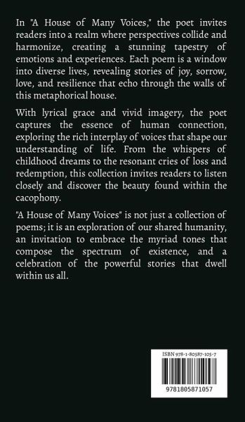 In "A House of Many Voices," the poet invites readers into a realm where perspectives collide and harmonize, creating a stunning tapestry of emotions and experiences. Each poem is a window into diverse lives, revealing stories of joy, sorrow, love, and resilience that echo through the walls of this metaphorical house. With lyrical grace and vivid imagery, the poet captures the essence of human connection, exploring the rich interplay of voices that shape our understanding of life. From the whispers of childhood dreams to the resonant cries of loss and redemption, this collection invites readers to listen closely and discover the beauty found within the cacophony. "A House of Many Voices" is not just a collection of poems; it is an exploration of our shared humanity, an invitation to embrace the myriad tones that compose the spectrum of existence, and a celebration of the powerful stories that dwell within us all.