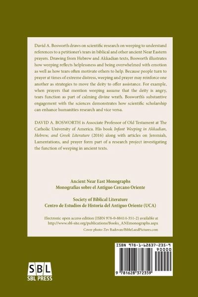 David Bosworth draws on modern research on weeping to understand references to the petitioner’s tears in biblical and other ancient Near Eastern prayers. Weeping reflects helplessness and being overwhelmed with emotion, and tears can motivate others to help. Similarly, people turn to prayer at times of extreme distress; therefore, weeping and prayer reinforce one another as strategies to move the deity to offer assistance. Bosworth finds that prayer that mention weeping also indicate that the deity is angry, so tears are a means of calming divine wrath. The book includes comparisons of Hebrew Psalms and Akkadian prayers with reference to modern scientific research on weeping.