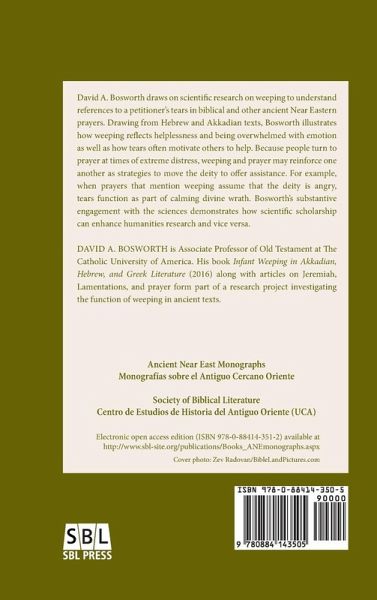 David Bosworth draws on modern research on weeping to understand references to the petitioner’s tears in biblical and other ancient Near Eastern prayers. Weeping reflects helplessness and being overwhelmed with emotion, and tears can motivate others to help. Similarly, people turn to prayer at times of extreme distress; therefore, weeping and prayer reinforce one another as strategies to move the deity to offer assistance. Bosworth finds that prayer that mention weeping also indicate that the deity is angry, so tears are a means of calming divine wrath. The book includes comparisons of Hebrew Psalms and Akkadian prayers with reference to modern scientific research on weeping.