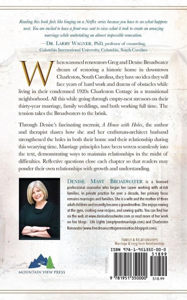 Reading this book feels like binging on a Netflix series because you have to see what happens next. You are invited to have a front-row seat to view what it took to create an amazing marriage while undertaking an almost impossible renovation. —Dr. Larry Wagner, PhD, professor of counseling, Columbia International University, Columbia, South Carolina Seasoned renovators Greg and Denise Broadwater dream of owning and restoring a historic home in downtown Charleston, South Carolina. What follows are six years of unimaginable challenges and successes concerning the renovation of their condemned 1920s Charleston Cottage, their place in a transitional neighborhood on Congress Street, and their thirty-year marriage. In a community that struggles to feel like home, alongside normal stressors of full-time work and family weddings, the heightened tension taxes the Broadwaters to the brink. Nothing is left untouched in their hundred-year-old cottage full of architectural and historical details, from the rotted floorboards to the hole in the roof and the knob-and-tube wiring that causes a fire. But through Denise’s fascinating memoir, A House with Holes, the Christian author and therapist shares how she and her craftsman-architect husband strengthened the holes in both their home and their relationship during this wearying time in order to survive and thrive. Using Broadwater’s counseling experience, marriage principles have been woven seamlessly into the text, demonstrating ways to maintain relationships in the midst of struggles. Reflective questions close each chapter so that readers may ponder their own relationships with growth and understanding.