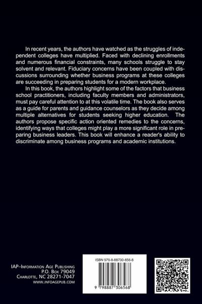 In recent years, the authors have watched as the struggles of independent colleges have multiplied. Faced with declining enrollments and numerous financial constraints, many schools struggle to stay solvent and relevant. Fiduciary concerns have been coupled with discussions surrounding whether business programs at these colleges are succeeding in preparing students for a modern workplace.In this book, the authors highlight some of the factors that business school practitioners, including faculty members and administrators, must pay careful attention to at this volatile time. The book also serves as a guide for parents and guidance counselors as they decide among multiple alternatives for students seeking higher education. The authors propose specific actionoriented remedies to the concerns, identifying ways that colleges might play a more significant role in preparing business leaders. This book will enhance a reader's ability to discriminate among business programs and academic institutions.