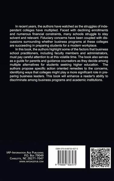 In recent years, the authors have watched as the struggles of independent colleges have multiplied. Faced with declining enrollments and numerous financial constraints, many schools struggle to stay solvent and relevant. Fiduciary concerns have been coupled with discussions surrounding whether business programs at these colleges are succeeding in preparing students for a modern workplace.In this book, the authors highlight some of the factors that business school practitioners, including faculty members and administrators, must pay careful attention to at this volatile time. The book also serves as a guide for parents and guidance counselors as they decide among multiple alternatives for students seeking higher education. The authors propose specific actionoriented remedies to the concerns, identifying ways that colleges might play a more significant role in preparing business leaders. This book will enhance a reader's ability to discriminate among business programs and academic institutions.
