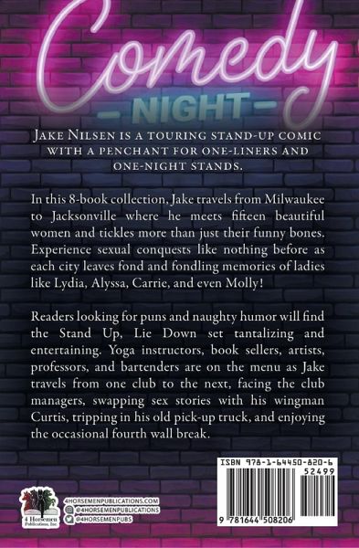 Jake Nilsen is a touring stand up comic with a penchant for one-liners and one-night stands. In this 8-book collection, Jake travels from Milwaukee to Jacksonville where he meets fifteen beautiful women and tickles more than just their funny bones. Experience sexual conquests like nothing before as each city leaves fond and fondling memories of ladies like Lydia, Alyssa, Carrie, and even Molly! Readers looking for puns and naughty humor will find the Stand Up, Lie Down set tantalizing and entertaining. Yoga instructors, book sellers, artists, professors, and bartenders are on the menu as Jake travels from one club to the next facing the club managers, swapping sex stories with his wingman Curtis, tripping in his old pick up truck, and enjoying the occasional fourth wall break.