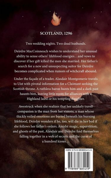 1296, Scotland Two wedding nights. Two dead husbands. Deirdre MacCoinneach wishes to understand her unusual ability to sense others' lifeblood energies...and vows to discover if her gift killed the men she married. Her father's search for a new and unsuspecting suitor for Deirdre becomes complicated when rumors of witchcraft abound. Under the façade of a trader, Alasdair Montgomerie travels to Uist with pivotal information for a Claimant seeking the Scottish throne. A ruthless baron hunts him and a dark past haunts him, leaving little room for alliances with a Highland laird or his tempting daughter. Awestruck when she realizes that her unlikely travel companion is the man from her visions, a man whose thickly veiled emotions are buried beneath his burning lifeblood, Deirdre wonders if he, too, will die in her bed if she follows her father's orders. Amidst magic, superstition, and ghosts of the past, Alasdair and Deirdre find themselves falling together in a web of secrets and the curse of a hundred kisses...