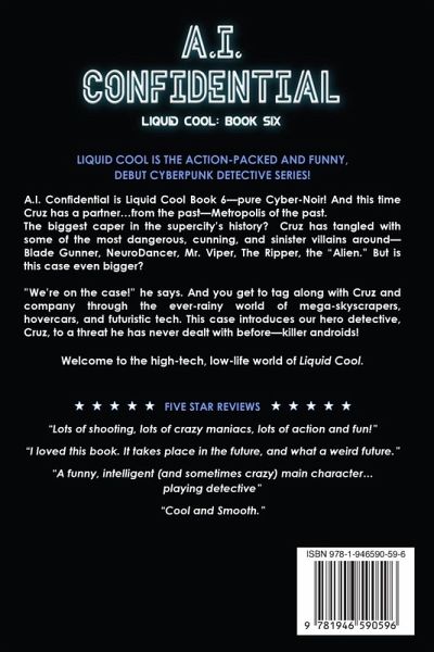 "We’re going to break wide open the biggest caper in Metropolis history!" Liquid Cool: The Cyberpunk Detective Series Is Back with more laughs and even more action in A.I. Confidential! The biggest caper in the supercity’s history? Cruz has tangled with some of the most dangerous, cunning, and sinister villains around—Blade Gunner, NeuroDancer, Mr. Viper, The Ripper, the "Alien". But this case is even bigger? Liquid Cool is Blade Runner meets the Maltese Falcon, then this novel is much more on the noir side than any other (call it cyber-noir or sci-fi noir). Bright neon, sharp shadows, thugs in fedoras, laser guns at the ready, and bloody discarded bodies in alleys. You don’t see this kind of gritty action, suspense, thrills, and even laughs in any "normal" science fiction. But this is Liquid Cool. "We’re on the case!" he says. And you get to tag along with Cruz and company through the ever-rainy world of mega-skyscrapers, hovercars, and futuristic tech. This case introduces our hero detective, Cruz, to a threat he has never dealt with before—killer androids! Welcome to the high-tech, low-life world of Liquid Cool.
