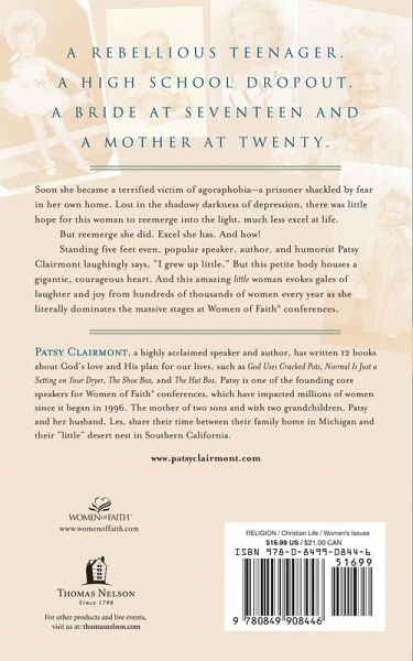 A rebellious teenager Patsy became a high school dropout, a bride at 17, and a parent at 20. Soon she became a terrified vicitim of agoraphobia and became a prisoner in her own home. Lost in the shadowy darkness of depression, there was little hope for this woman to reemerge into the light, much less excel at life. But reemerge she did. Excel she has. And how! Standing five feet even, popular speaker, author, and humorist Patsy Clairmont laughingly says, "I grew up little," But this petite body houses a gigantic, courageous heart. And this amazing little woman evokes gales of laughter and joy from hundreds of thousands of women every year as she literally dominates the massive stages of Women of Faith(R) conferences.